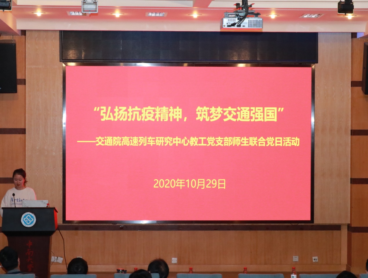 为了发挥“全国党建工作样板支部”的带头作用,加强党支部建设,发挥党员先锋模范作用,促进电子竞技博彩 人才培养工作,在电子竞技博彩 党委的领导下,10月29日晚上六点半,交通院高速列车研究中心教工党支部联合电子竞技博彩 博士、硕士和本科生5个学生党支部在铁道校区国际报告厅开展“弘扬抗疫精神,筑梦交通强国”主题党日活动,铁道校区关工委常务副主任张国强,电子竞技博彩 党委副书记宋晓东、党委委员韩锟副院长、彭勇副院长,全体党支部书记、各支部党员、发展对象、入党积极分子160余人参加本次活动,现场座无虚席。本次活动由交通设备与控制工程第二学生党支部书记任琭同志主持。