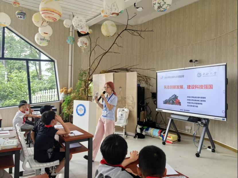 活动中,志愿者首先深情讲述了科学家们追求真理、无私奉献的动人故事,在孩子们心中悄然播下崇尚科学、勇攀高峰的种子。紧接着,团队生动展示了中南大学在高速铁路领域取得的多项突破性科研成果,复杂的列车技术通过深入浅出的讲解变得触手可及,点燃了现场学生的科技热情。互动环节气氛热烈,孩子们围绕高铁科技踊跃提问,与大学生志愿者们展开了充满童趣又富有深度的对话。活动还特别设置了创意绘画环节,鼓励孩子们用画笔描绘心中的“未来高铁”。小画家们兴致勃勃,发挥奇思妙想,一幅幅充满科技感与童真色彩的画作跃然纸上,展现了他们对轨道交通未来的无限畅想。