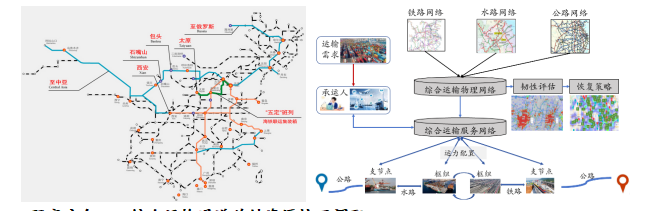 综合运输网络优化旨在构建“基础设施硬联通+运营服务软联通”的多式联运体系,通过“物理网络”的精准衔接与“服务网络”的高效协同,提升整体运输效能。物理网络聚焦基础设施立体化协同,服务网络侧重运营智能化与一体化,应用运筹优化、群体智能计算理论,结合数据驱动和模型驱动等方法,实现综合运输网络的布局优化、综合运输系统韧性评估和功能恢复策略优化,提升综合运输网络效能。