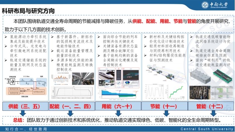 团队从供能、配能、用能、节能与管能全链条发力,为行业提供关键技术支撑,助力实现碳达峰、碳中和目标,推动轨道交通的可持续发展。