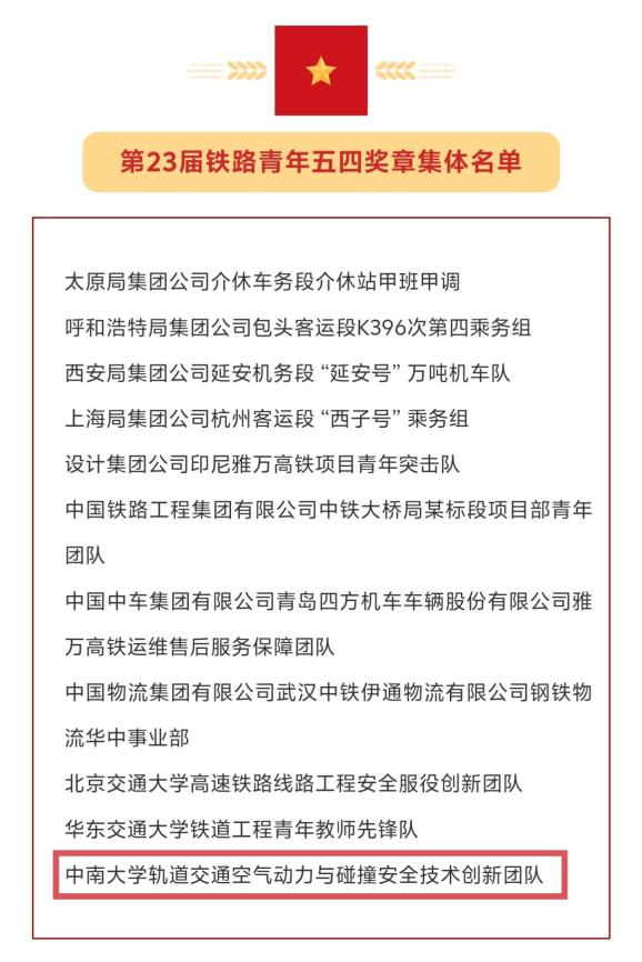 5月4日,为充分发挥青年典型模范带头作用,引领和激励广大青年在实现铁路高质量发展进程中接续奋斗,全国铁道团委颁授第23届铁路青年五四奖章,中南大学轨道交通空气动力与碰撞安全技术创新团队获评“铁路青年五四奖章集体”,全国仅三个高校团队获此荣誉。