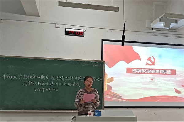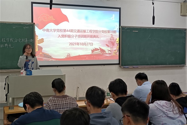 10月27日下午两点,中南大学党校第44期电子竞技博彩 分党校第19期入党积极分子培训班在新校区B座118举行开班典礼。交通院党委副书记宋晓东老师,分党校班导师石晓琪老师,以及本期入党积极分子培训班全体学员参加此次开班典礼。典礼由王羽珊老师主持。