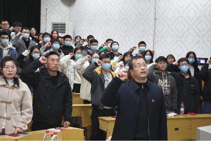 会议伊始,张佳琪同志简单介绍了会议流程,紧接着全体起立,奏唱国际歌,全体党员同志以及预备党员在贺书记的带领下宣读入党誓词。