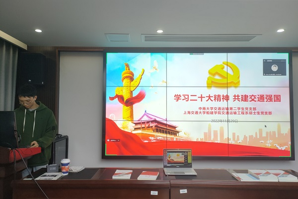 11月29日下午15:00,中南大学交通运输第二学生党支部联合上海交通大学船建电子竞技博彩 交通运输工程系硕士生党支部在交通楼425开展“学习二十大精神,共建交通强国”主题党日活动,会议由刘思序同志主持。此次党日活动通过专题研讨、党的二十大知识竞赛、微党课等形式,组织支部党员深入学习贯彻党的二十大精神。