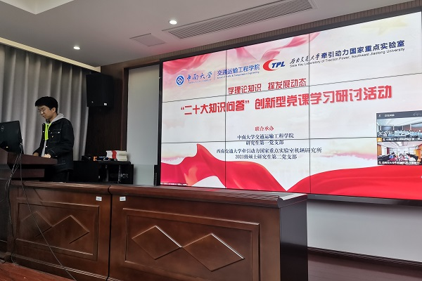 12月3日下午15:00,电子竞技博彩 研究生第一党支部于交通楼425开展与西南交通大学牵引动力国家重点实验室机车车辆研究所2021级硕士研究生第二党支部联合举办的“青春献礼二十大,强国有我新征程”支部共建系列活动第二期——“学理论知识,探发展动态”创新型党课学习研讨,活动由双方支部书记刘家忱同志和黄勉同志主持,双方支部全体党员和入党积极分子参加本次活动。