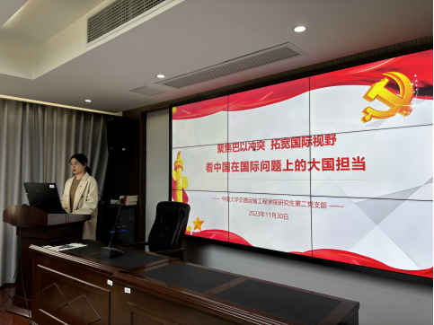 11月30日10:00,研究生第二党支部在交通楼425开展了“聚焦巴以冲突 拓宽国际视野 看中国在国际问题上的大国担当”主题党课。本节党课由支部书记章孟丹同志主讲,支部全体党员参加学习。