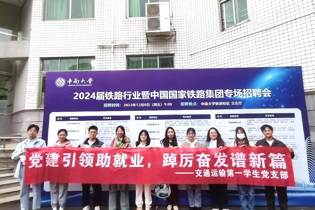 12月8日—9日,中南大学2024届铁路行业暨中国国家铁路集团专场招聘会在铁道校区立志厅及世纪楼开展,十九个用人单位组团招聘,吸引了众多学生前来应聘。为发挥党员先锋模范作用,给用人单位和学生提供精细化服务,支部成员主动担任招聘会学生助理,到不同路局协助工作,并提前与其负责人进行对接,提供各项所需。