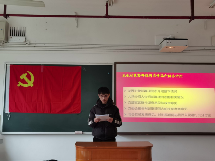 会议伊始,王羽珊同志介绍了会议流程和要求。随后,谢瑞、郁盼婷、肖镇钟、林武铉、彭群理、邓沛六位同志依次宣读《入党志愿书》,汇报了个人履历、入党动机和对党认识等内容。入党介绍人分别介绍其基本情况,支部宣读群众调查意见与政治审查情况,支委会宣读对六位同志的考察意见,与会党员同志发表意见。大会进行无记名投票,六位同志被支部接收为预备党员。