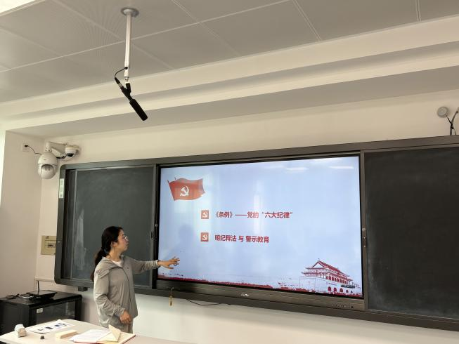 紧接着,纪检委员王梦婷同志以“学条例、明纪律、强党性”为主题给支部党员上了一堂简洁生动的党课。她从《中国共产党纪律处分条例》提出的六大纪律出发,向大家讲解学生党员在日常的学习工作中应该注意的问题,并提醒支部党员面对日益复杂的网络舆情,必须保持高度的政治警觉性,坚决抵制各种错误思潮和言论的侵蚀。为突出以案促学,加深党纪学习教育的成效,她组织支部党员观看湖南省反腐纪录片,通过身边的真实案例进行警示教育,进一步筑牢党员们的纪律意识和道德防线。