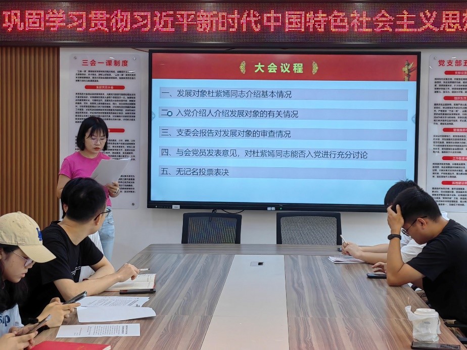 首先,杜紫嫣同志、张娜同志分别介绍自己的基本情况、入党动机、对党的认识、现实表现等,然后两位同志的入党介绍人对她们的主要情况进行介绍,并对她们能否入党表明态度;支委会报告对发展对象的审查情况及征求与会党员意见,对两位同志能否入党进行充分讨论;接着,大会采用无记名投票方式对两位同志进行表决。经过大会的讨论,党支部同意接收杜紫嫣同志、张娜同志为中共预备党员。