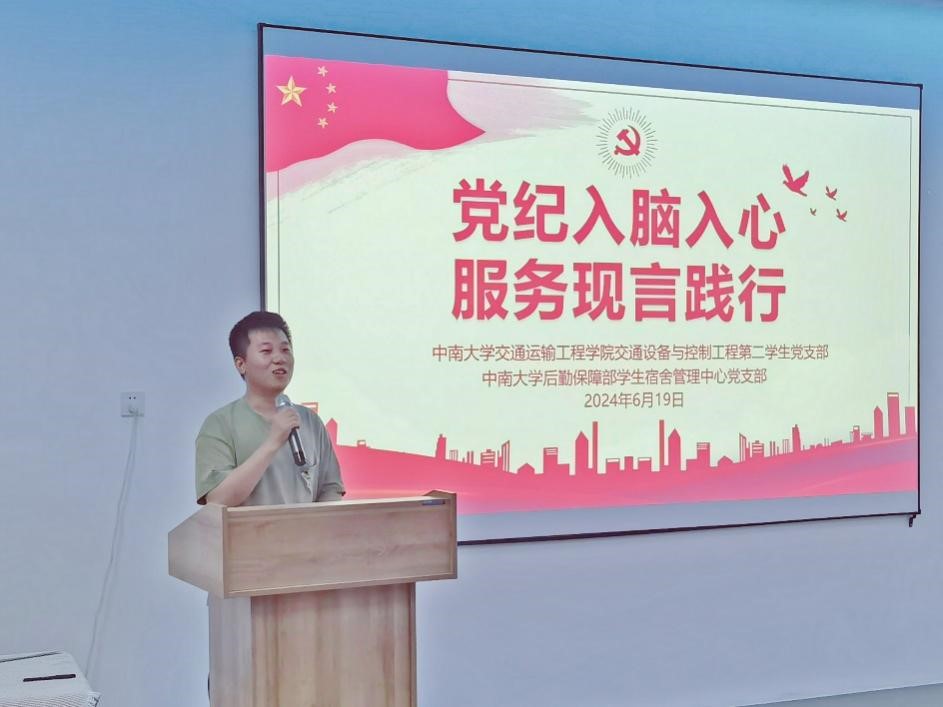 6月19日下午16:00,电子竞技博彩 交通设备与控制工程第二学生党支部、后勤保障部学生宿舍管理中心党支部在铁道校区共同举办“党纪入脑入心,服务现言践行”主题实践活动,本次活动由交通设备与控制工程第二学生党支部张健书记主持,两支部全体党员同志参加。