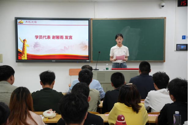 学员代表谢馨雨同学作表态发言,郑重承诺全体学员坚决做到“两个维护”,自觉传承红色基因,推动理论与实践深度融合,坚持知行合一、学以致用,积极参与社会实践和志愿服务活动,在各项工作中争做表率,努力树立新时代党员发展对象的良好形象。