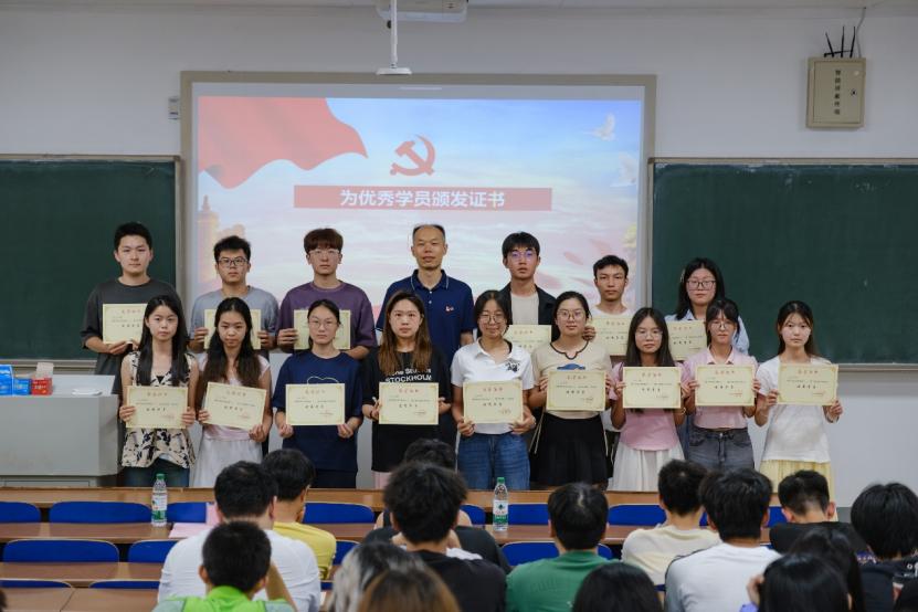 典礼第二项,张佳琪老师宣读本期培训班表彰决定。经公平公正的综合评选,罗清,相怡帆被评为本期培训班优秀学员标兵,王佳祺等十五位同学被评为优秀学员。随后,李苑副书记为优秀学员和优秀学员标兵颁发证书。