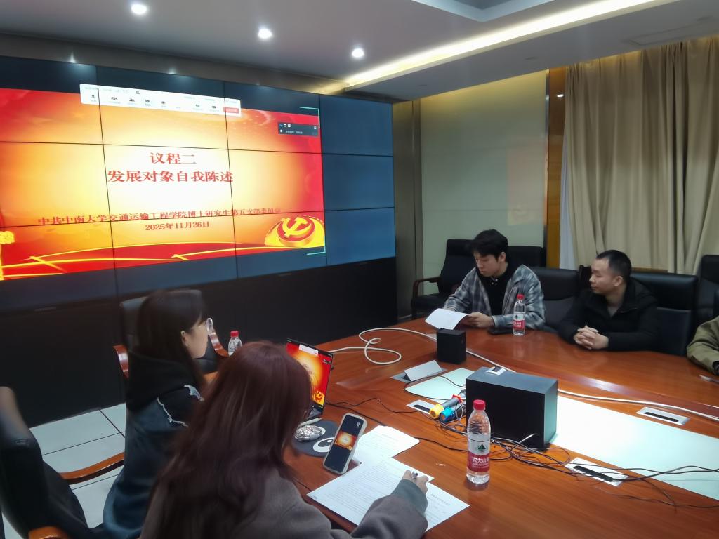 为进一步加强基层党组织建设,通过吸纳新鲜血液壮大党员队伍,同时深入学习贯彻党的最新理论成果,提升博士生党员的政治素养与宏观视野,2025年11月26日晚20:00,电子竞技博彩 博士研究生第五党支部在交通楼518会议室隆重召开支部党员大会。本次会议由党支部副书记王钰涵同志主持,主要议程包括讨论接收文梦凡同志为中共预备党员以及集中学习党的二十届四中全会精神,会议应到有表决权党员21人,实到17人,线上参会4人,根据《中国共产党章程》和《中国共产党发展党员工作细则》的有关规定,符合法定开会人数。