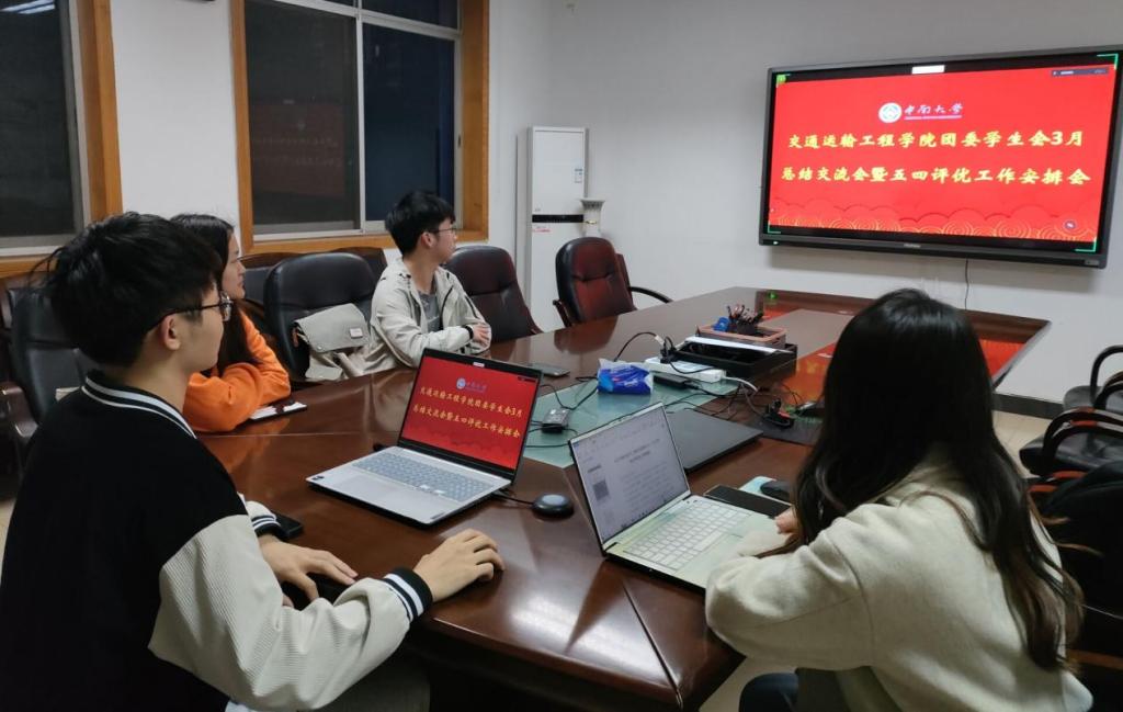 团委学生会于交通楼322举行三月工作总结交流会。本次会议以线上与线下相结合的方式开展,由院学生会主席杨林乐主持,院团委学生会各部门部长参会。