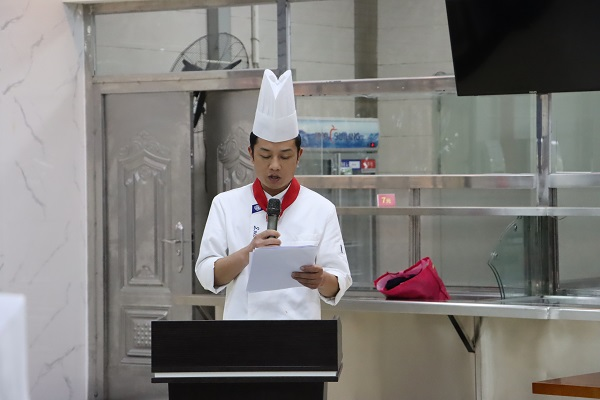 活动伊始,主持人对参与厨艺争霸赛学生厨艺指导与培训的厨艺导师们进行了一一介绍,并现场宣布了“师徒结对子”的分组名单。此次活动共有15名厨师长和30支参赛队伍参加,食堂主任黄金亮担任厨艺总指导。活动采取1位厨师长联系2支参赛队伍的形式对所有参赛学生进行针对性烹饪指导与培训。