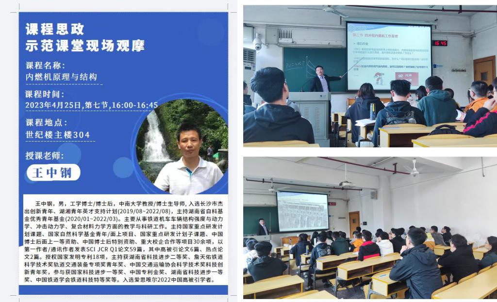 世纪楼主楼304教室,王中钢教授讲授内燃机原理与结构课程,10名教师参与课程思政示范课堂现场观摩。王中钢教授在课程讲授中融入团结协作等思政元素,采用了多种互动形式,课堂气氛活跃。
