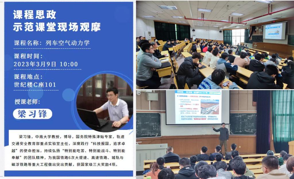 2023年3月9日,在铁道校区世纪楼C座101教室,高速列车研究中心梁习锋教授向研究生们讲授列车空气动力学课程,并有20名教师参与到课程思政示范课堂现场观摩。在课程讲授过程中,梁习锋教授生动地融入了我国高铁发展过程中科研人员们艰苦卓绝的奋斗故事,激发了学生们刻苦钻研、科技报国的担当与决心。