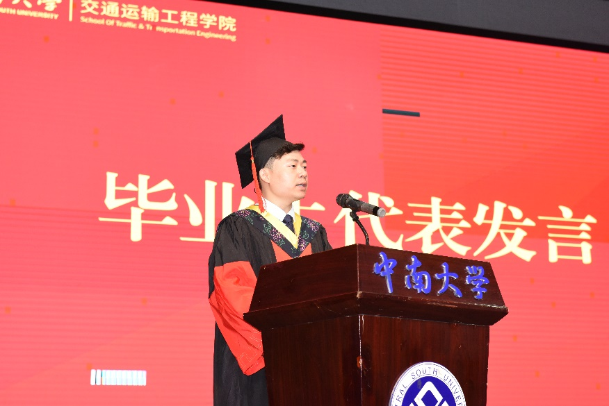 证书颁发完毕后,研究生毕业生代表李翔和本科毕业生代表王尚君同学发言。他们回忆了在中南大学生活学习的点滴经历,回忆了自己为梦想和未来奋斗的青葱岁月,表达了对学校电子竞技博彩