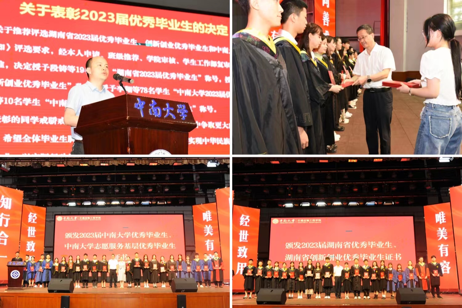 毕业生名单宣读完毕后,副院长刘辉宣读《关于表彰2023届优秀毕业生的决定》,并宣读湖南省2023届优秀毕业生、湖南省2023届创新创业优秀毕业生、中南大学2023届优秀毕业生、中南大学2023届志愿服务基层优秀毕业生名单。院党委书记贺志军为湖南省优秀毕业生、湖南省创新创业优秀毕业生颁发荣誉证书,副院长张英贵、韩锟为中南大学优秀毕业生、中南大学志愿服务基层优秀毕业生颁发荣誉证书。