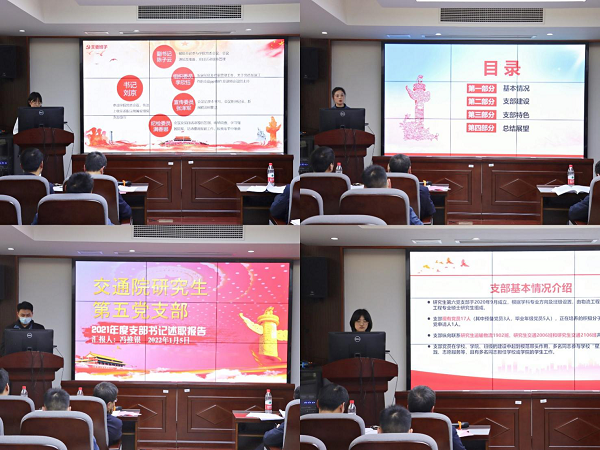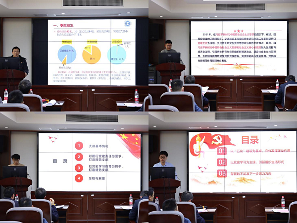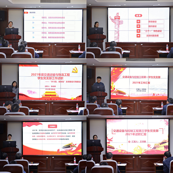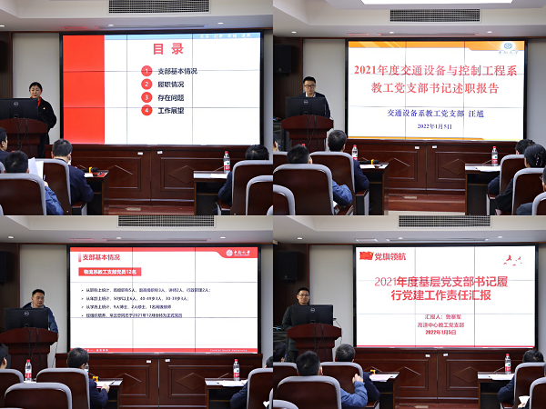 首先由各个支部书记就本年度支部和个人工作进行述职,最先进行汇报的是教职工党支部书记。交通运输系教工党支部、交通设备与控制工程系教工党支部、物流工程系教工党支部、高速列车研究中心教工党支部的4个支部书记分别从支部2021年的基本工作情况、书记的履职情况、教职工党员这一年的科研成果、支部的组织生活等方面都进行了详细介绍,同时也都指出了这一学年在支部建设中存在的问题,以及未来改进的方向。电子竞技博彩 党委成员对四个教工党支部进行了点评,在支部建设、党史学习教育等方面都有所进步,但仍然存在先锋模范带头作用还发挥不够的问题,下一步要继续加强。对于高速列车研究中心党支部尤其提出要配合学校做好寒假期间的疫情防控工作。