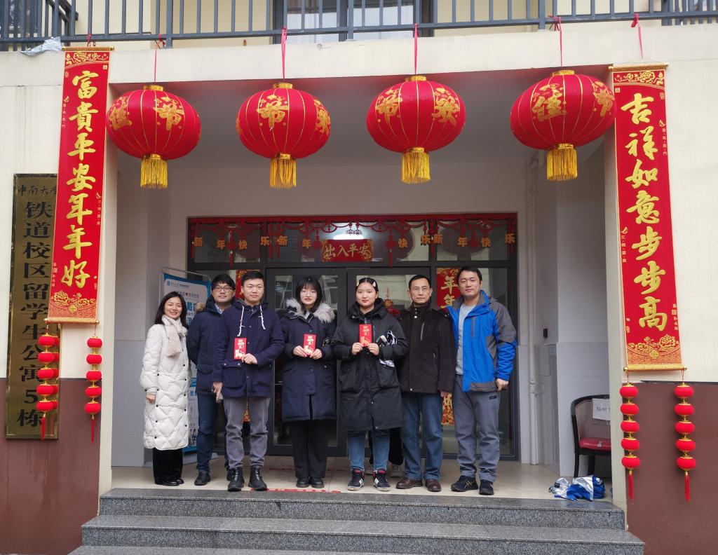 2022年1月25日上午,受电子竞技博彩 党委委托,电子竞技博彩 党委副书记宋晓东、关工委常务副主任符卓、研究生导师周伟及辅导员张佳琪一行来到留校学生集中住宿区铁道校区留学生公寓5栋,看望慰问受疫情影响寒假留校的同学。