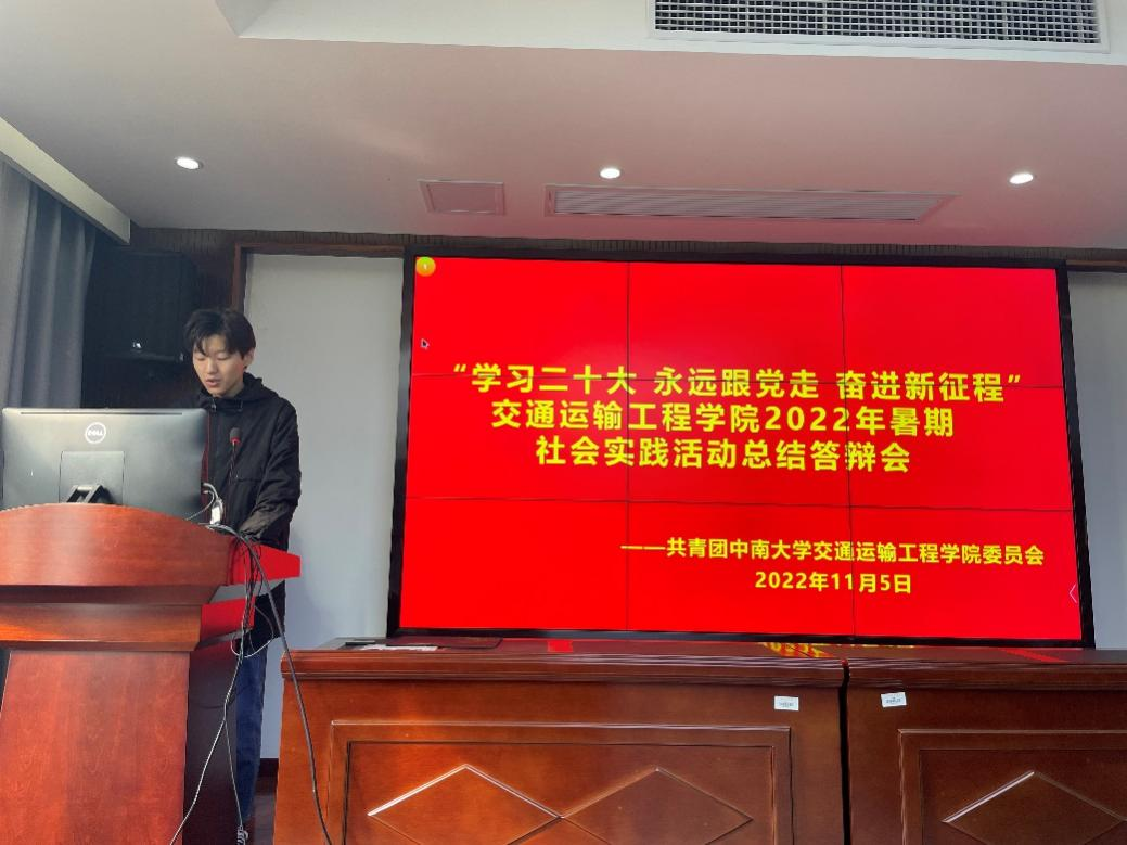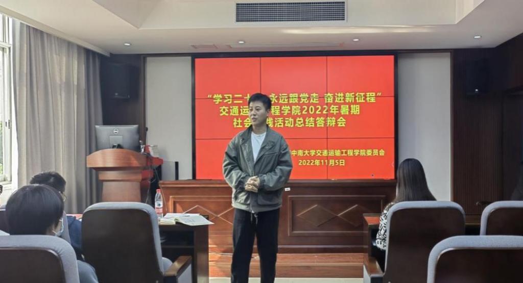 11月5日上午10:00,电子竞技博彩 “学习二十大,永远跟党走,奋进新征程”2022年暑期社会实践活动总结答辩会于铁道校区交通楼425成功举行。电子竞技博彩 团委书记张健老师、团委副书记郑繁简老师、团委副书记易思睿担任答辩评委,6支暑期社会实践团参与本次答辩。本次总结答辩会由庄明宇同学主持。