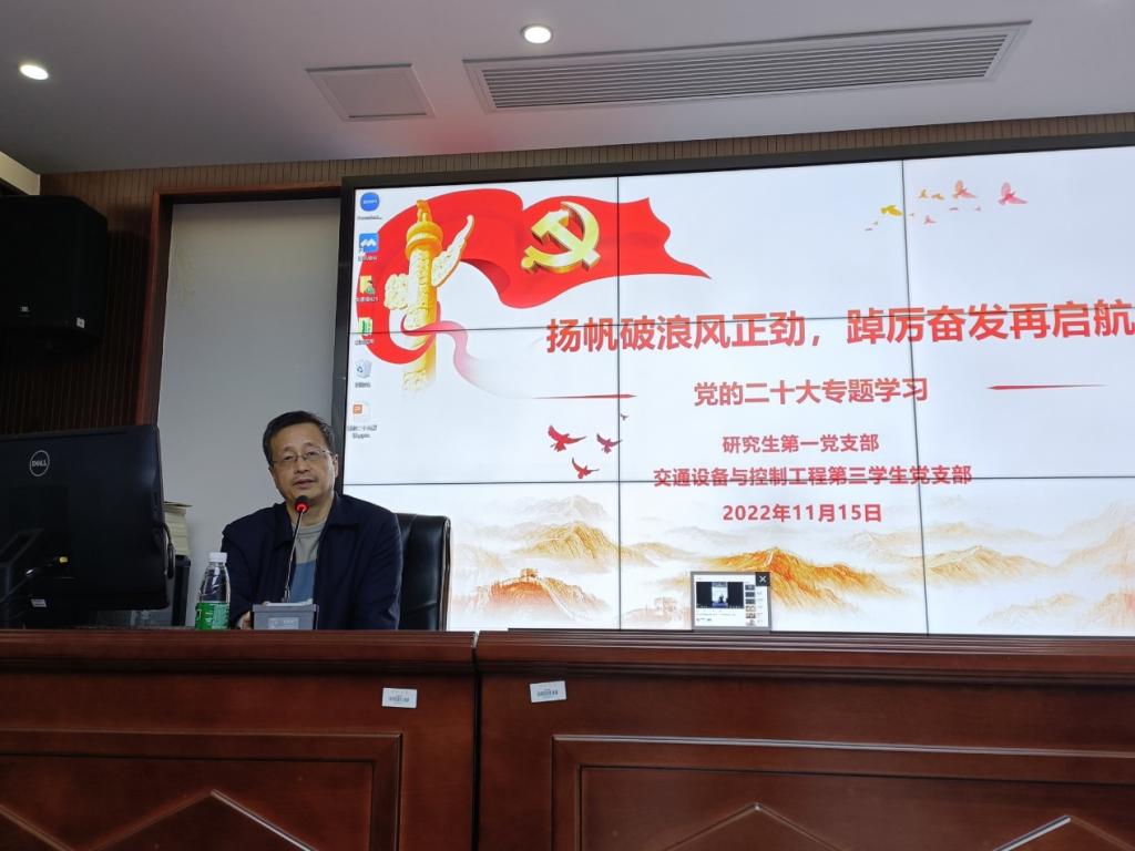 为深入学习贯彻党的二十大精神,加强支部党员政治理论学习,11月15日晚19点,电子竞技博彩 党委书记贺志军于交通楼425为研究生第一党支部、交通设备与控制工程第三学生党支部全体党员讲授《党的二十大精神解读》专题学习党课,本次党课由研究生第一党支部书记刘家忱同志主持。