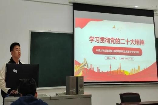 11月19日上午9:00,电子竞技博彩 研究生第五党支部于交通楼515开展学习贯彻党的二十大精神专题党课。本次党课由党支部书记王鑫同志主讲,支部全体党员同志参加学习。