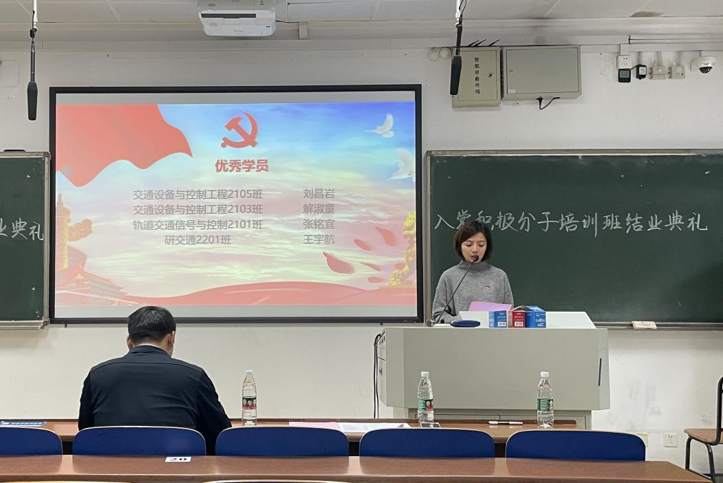 随后,交控2101班张铭宜同学作为优秀学员代表发言。她首先对此次培训班的全体授课教师表示感谢,并表示通过各项教学环节,她逐步明晰了中国共产党艰苦卓绝的奋斗历程,深刻体悟了党的二十大精神,明确了当代青年的历史使命担当,更加坚定了把青春奋斗融入党和人民的建设事业中,为实现中华民族的伟大复兴贡献青春力量。最后,她呼吁全体学员不负韶华,砥砺前行,为党和人民服务贡献。