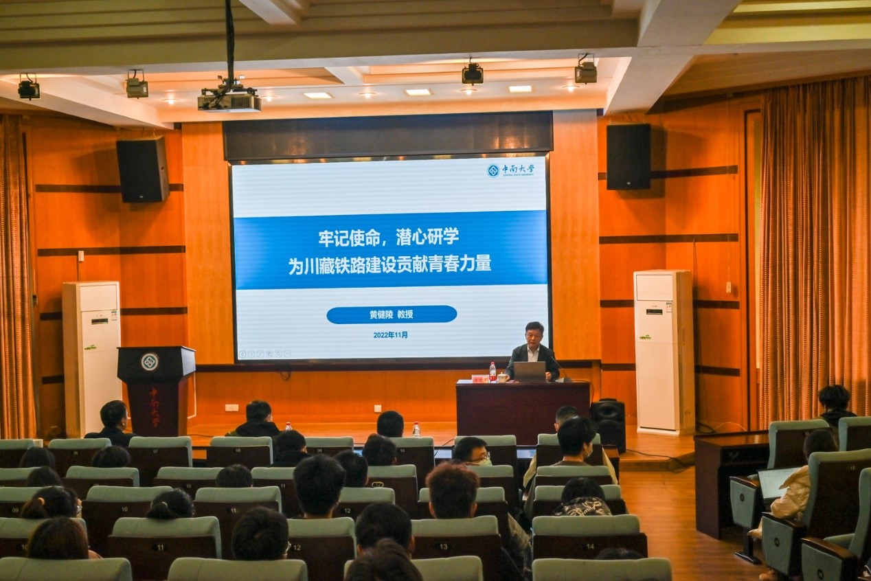 11月25日下午15:00,校党委副书记黄健陵教授于铁道校区世纪楼C201报告厅为交通院和公管院学生讲授了题为“牢记使命,潜心研学——为川藏铁路建设贡献青春力量”的思政课。公管院党委副书记耿贵斌、副院长姜国俊,交通院党委副书记宋晓东、学生办公室主任樊佳俊、以及交通院、公管院两院学生140余人参加,宋晓东副书记主持。