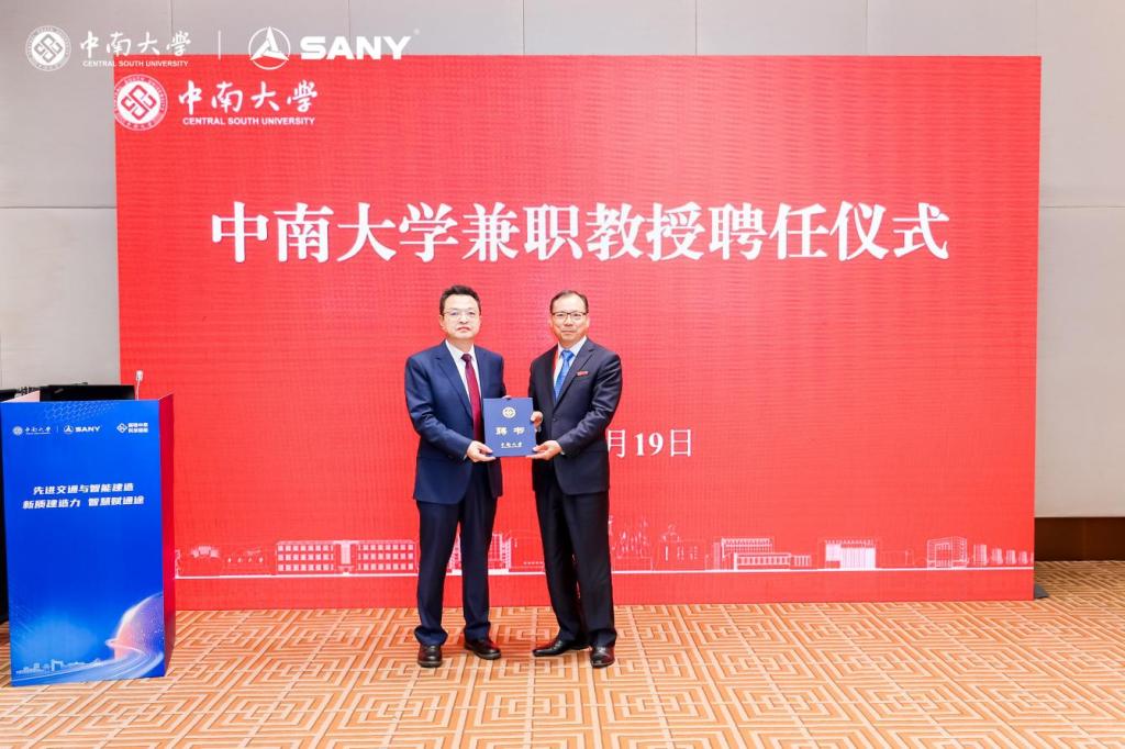 中南大学校长李建成为三一集团有限公司轮值董事长、总裁唐修国颁发兼职教授聘书