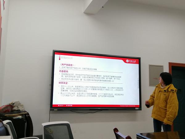 接着,本年度党支部第三批发展对象候选人杜潇、肖欣做个人汇报。两位同志从入党动机、学习科研成果及社会工作经历、志愿服务等方面向党组织详细汇报了自身情况。杜潇同志积极学习毛泽东思想和党的理论知识,思想进步、团结同学,认真扎实地开展学生工作与科研工作,为身边的人树立了良好榜样。肖欣同志在本科学习阶段时,学习、思想等各方面皆表现优异,成为研究生后依旧热心科研,学习认真,团结同学,起到了模范带头作用。