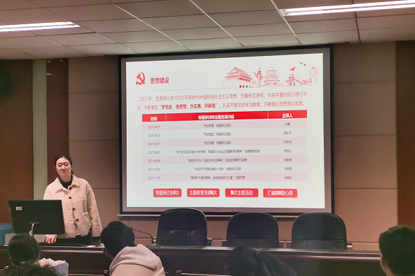 会议伊始,支部书记陈晨老师从思想建设、组织建设、“三个一”特色建设和支部问题查摆等四个方面对支委一年来的工作进行述职。她指出,这一年以来,支部建设取得了很大的进展与成就。在思想建设方面,支部充分利用“学习强国”开展党员学习教育活动,其中支部蒋艾佳同志入选中南大学2021年学习强国积分最高前10名。在组织建设方面,做到“组织生活常态化”、“管理服务精细化”、“工作制度体系化”、“宣传工作规范化”,促进支部体系完整、运行高效。在特色建设方面,支部定期开展“启读坊”、“学党史”、“办实事”的活动,充分发挥了支部的战斗堡垒作用。
