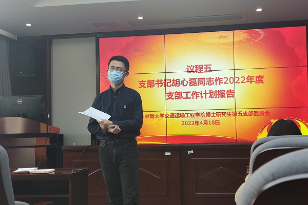 选举工作结束后,支部书记胡心磊同志向大会作2022年度支部工作计划报告。他提到,博士研究生第五党支部作为一个刚成立的支部,目前由22名党员同志组成。博五支部与原博二支部同根同源,每位党员同志都很优秀,既能联系群众,又起到先锋模范作用。希望各位同志今后继续发光发热,既管理规划好个人,又能将支部建设得更好。相信在新一届支部委员的带领下,博士研究生第五党支部能服务好师生,管理监督好党支部成员,做好党建工作,同时能够积极开展专业之间的交流分享活动,相互帮助,共同进步。接着,胡心磊同志组织支部所有同志进行自我介绍,以促进党支部全体党员之间互相了解。