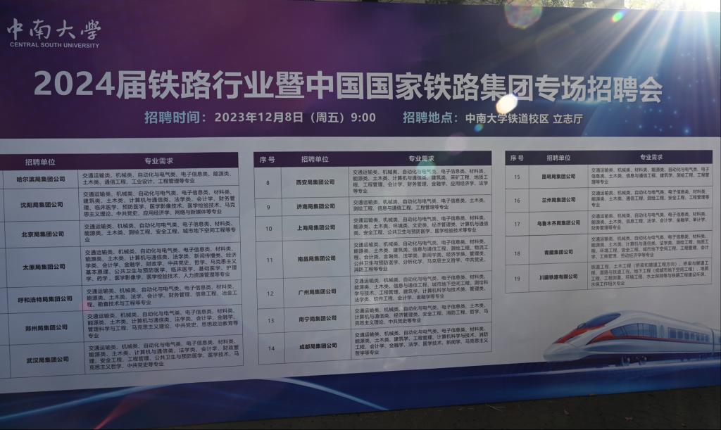12月8日上午9时整,2024届铁路行业暨中国国家铁路集团专场招聘会在中南大学铁道校区立志厅顺利举行。