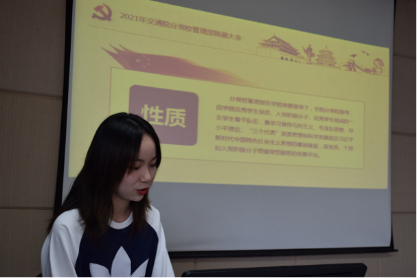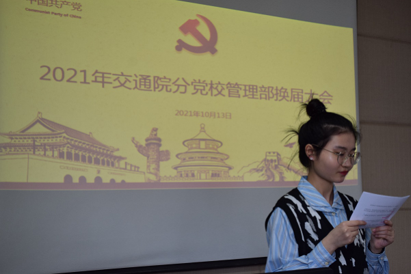 10月13日下午三时,电子竞技博彩 2021年分党校管理部换届大会在交通楼513室顺利举行。电子竞技博彩 研究生辅导员、党组织干事张佳琪,党组织干事朱显研及分党校管理部新老成员参加会议。会议由肖奕忆同学主持。