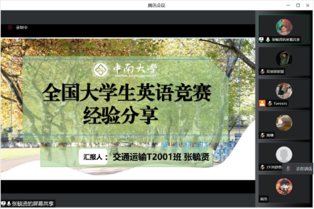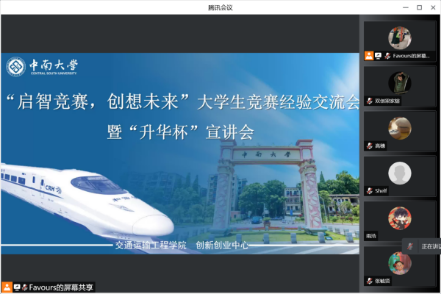3月26日晚19:00,交通院“启智竞赛,创想未来”竞赛经验交流会暨升华杯宣讲会于线上顺利举行。会议邀请了张毓贤、张普阳、杨嘉钰、石琳昌、李卓林、陈欣等同学以及傅航老师向同学们分享竞赛相关经验。本次会议由熊梓彤同学主持。