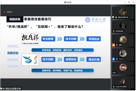 随后,石琳昌、李卓龙、陈欣几位同学向同学们讲述了参加各种竞赛的注意事项,阐述分析了竞赛过程中的常见问题以及解决方案,同时,他们还分享了自己以前在参加竞赛时的有趣经历。在竞赛经历分享后,傅航老师重点介绍了“升华杯”大学生创业计划大赛,让同学们对“升华杯”有了一定的了解,同时,也向同学们传授了许多关于筹备大赛的经验与心得。