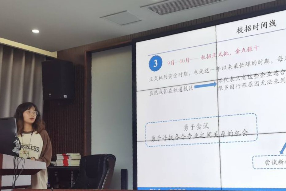 崔云平同学分享结束后,赵惠娴同学围绕“就业前期准备——信息收集”展示了校招时间线:5月至6月底各大企业会发布实习信息;7月至8月底企业提前批岗位集中发布,这是同学们第一次接触企业、了解岗位的机会,同学们可以借此锻炼胆量和语言能力并积累面试经验;9月至10月是秋招正式批的黄金时期。赵惠娴同学鼓励同学们积极寻找专业和不同岗位的关联点,大胆尝试,抓住机会,并以自身专业为例指出了轨道交通信号与控制专业的各种去向。然后,赵惠娴同学分享了多种就业信息收集方式和渠道,如中南大学就业信息网、中南大学就业指导中心公众号、企业招聘官网、offershow小程序、脉脉APP等,希望能帮助同学们合理有效地收集和了解企业校招的最新消息。