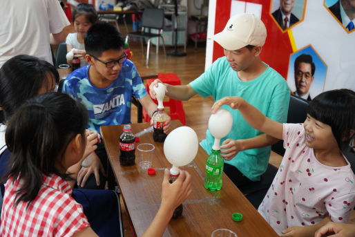 在演示讲解结束后,每位实践团成员带领一组小朋友进行实验操作,在实验中感受科学。在实验完成后,实践团成员史金琴为同学们解析了实验原理,提出了溶解度的科学概念,解开二氧化碳增加之谜,同时也拓展了可乐在生活中的妙用以及过多饮用可乐对身体造成的影响。