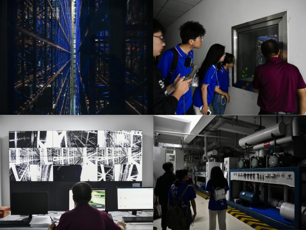 接着,张宝亮经理带领实践团队进入监控室与一号机房,深入了解了智能冷库储藏规模与运行过程。冷库内部出入库的任务周期仅为三分钟,在自动化识别的基础上仍然可以手动调节存储位置,提高工作速度的同时也保障了工作效率。智能冷库共计三万多拖位,容量近1万吨,存藏有伊利、三全、星巴克与肯德基等多个品牌冷藏品,可恒温制冷至零下18度,实现冷藏货物自动出入库、自动盘点、自动调度等功能。在机房,张宝亮经理带领团队成员参观了制冷机等相关设备,并随行讲解相关工作经验,令团队成员获益匪浅。