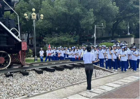 学生在志愿者的带领下来到铁路园,在这里共铺设四条铁路线,其中三条陈列着在中国铁路发展史中具有代表性的三辆机车——建设型蒸汽机车、东风型内燃机车以及韶山型电力机车。每辆机车前有学生志愿者为学生讲解该机车历史、其转向架结构、车体构成、车身连接装置等列车基本知识。在讲解韶山型电力机车时,志愿者以一首《火车向着韶山跑》作为结语,“车轮飞,汽笛叫,火车向着韶山跑,穿过峻岭越过河”的歌词反映当时“铁路人”建设组国的决心。同学们也为了先辈们的奋斗精神、爱国精神而感到震撼与尊敬。