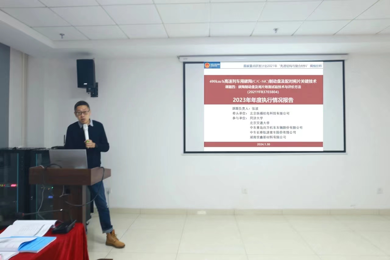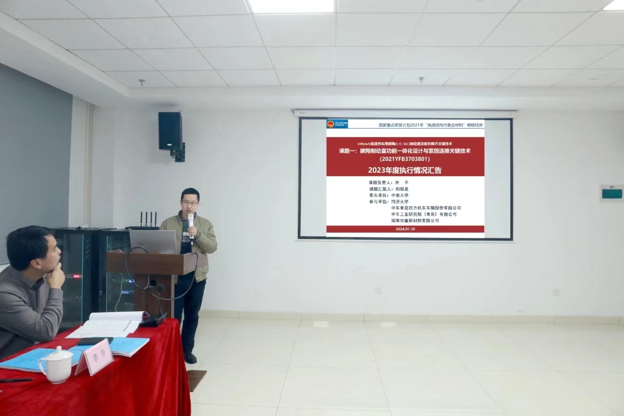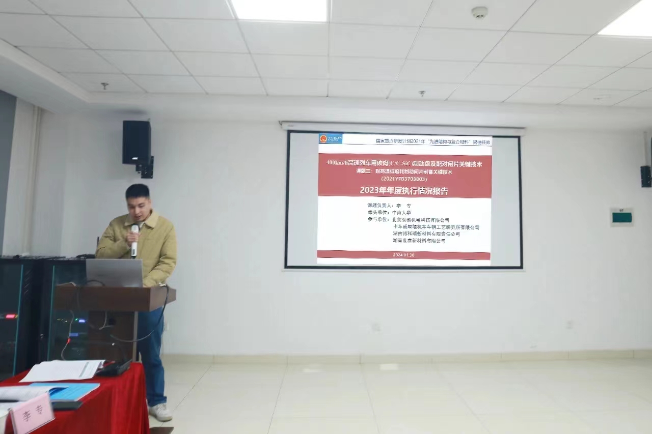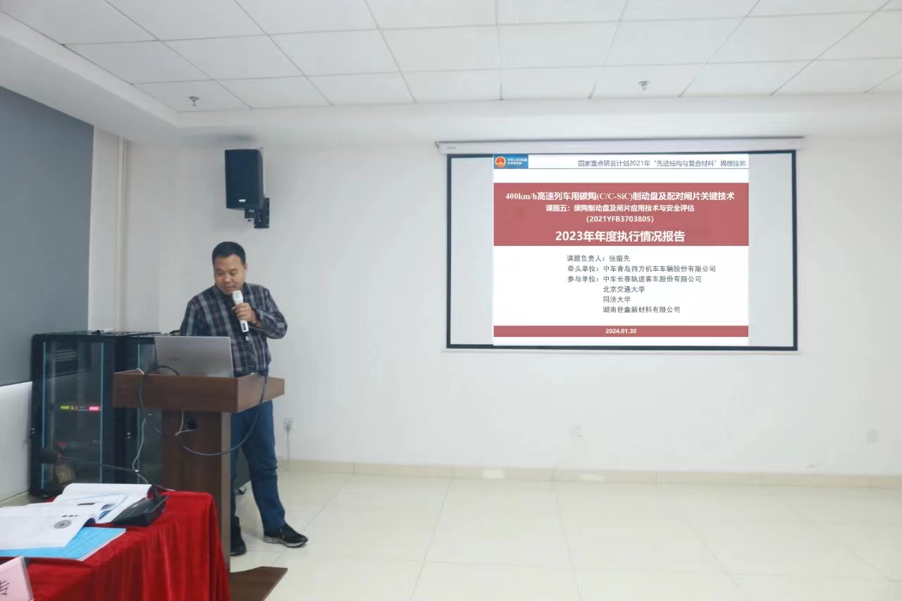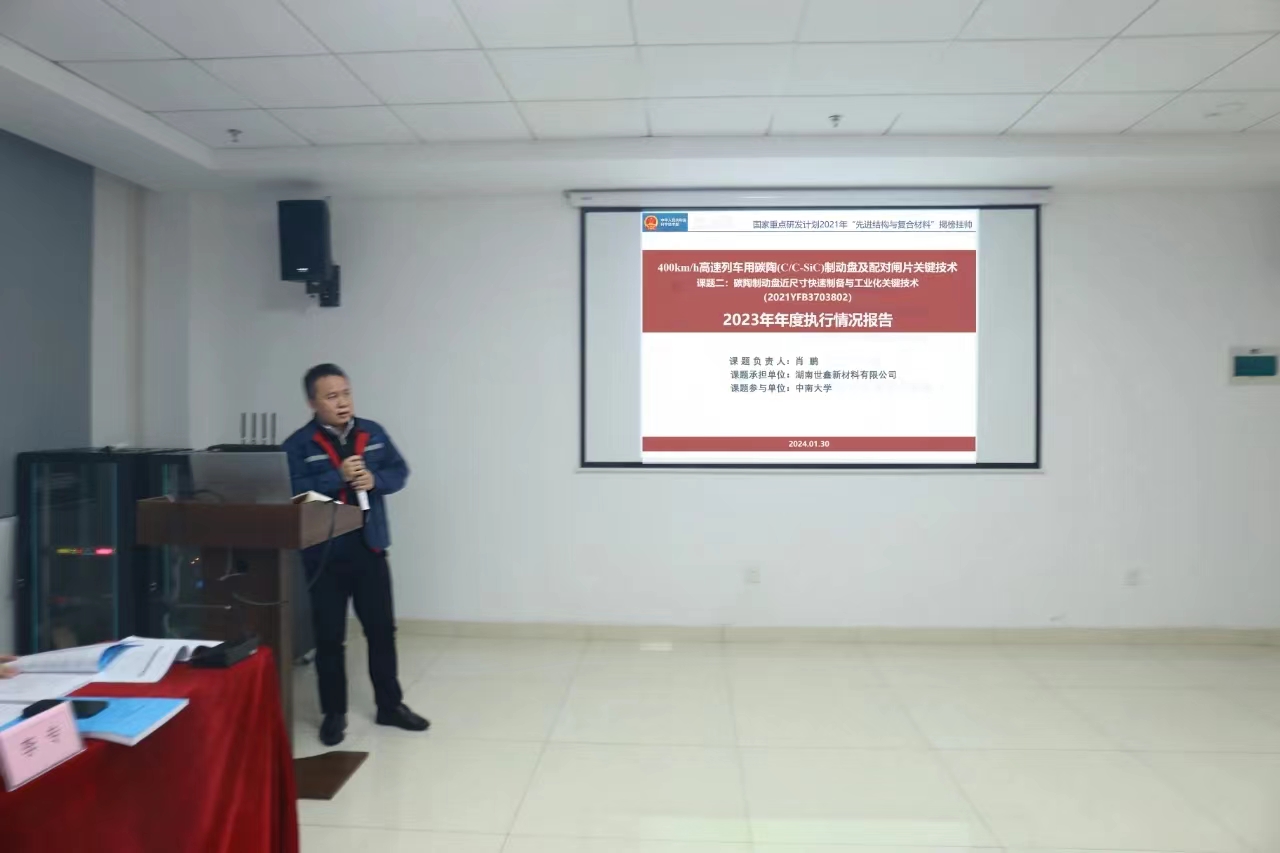 2024年1月30日,国家重点研发计划“400km/h高速列车碳陶(C/C-SiC)制动盘及配对闸片关键技术(2021YFB3703800)项目”2023年年度总结会在世鑫新材成功召开。本次会议由中南大学召集、世鑫新材承办,项目成员单位中南大学、世鑫新材、铁科院纵横机电、四方股份、中车工业研究院、同济大学、北京交通大学、中车戚墅堰所、湖南博科瑞等单位的领导、专家、研究骨干、研究生等30多人参会。